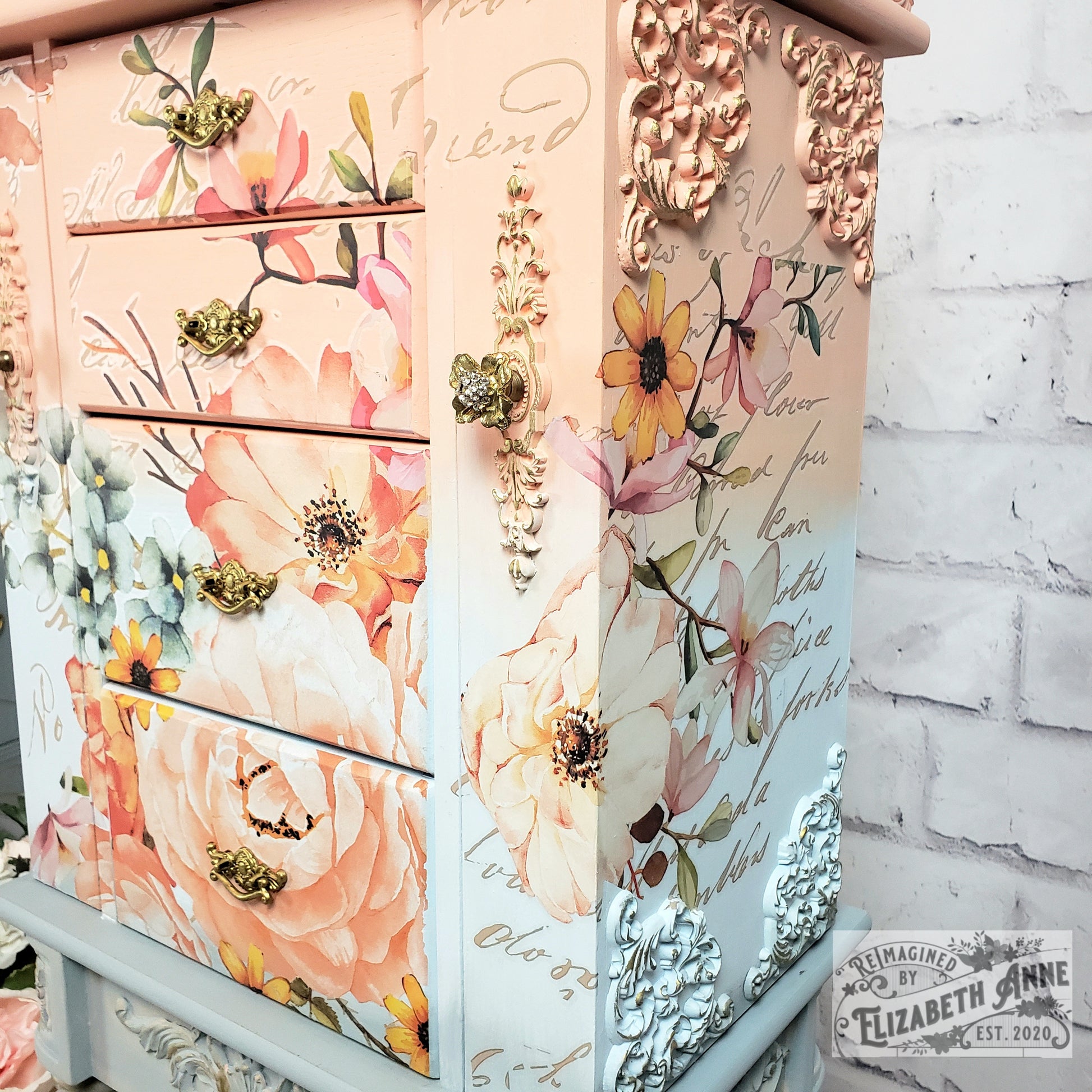 This is a true one of a kind jewelry armoire hand-painted in shades of gray-blue, light blue and apricot pink. Beautiful roses and florals wrap around the body with gold french script. It has the most exquisite and detailed molding wrapping on the corners of every inch of the armoire with highlights of gold to accent. It includes a large storage area on top for rings and small items under the flip up top lid. It has two storage areas that open on each side for long necklaces and four drawers for extra storage. It has beautiful beading around the legs, which can be removed if desired, in a shade of stunning gray-blue with accents of apricot and gold. All drawers and storage have been relined in a beautiful light pink felt. The armoire measures 15" wide, 10" deep and 37" tall.