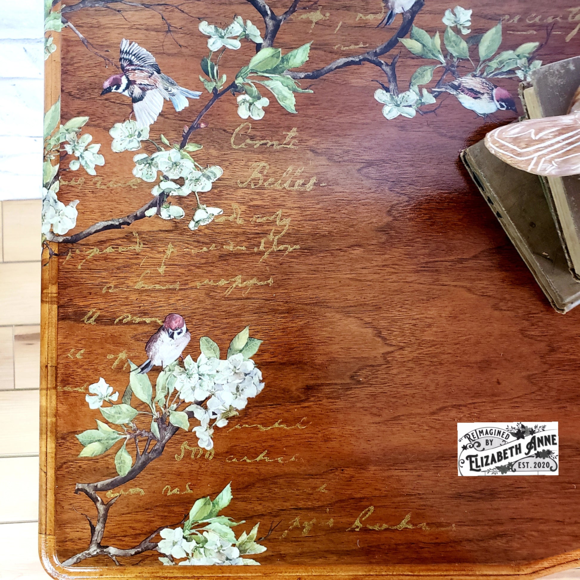 Vintage Duck Egg Blue Bird and Blossom Desk | Make-up Station | Gold Antique Vanity | Natural Wood Furniture